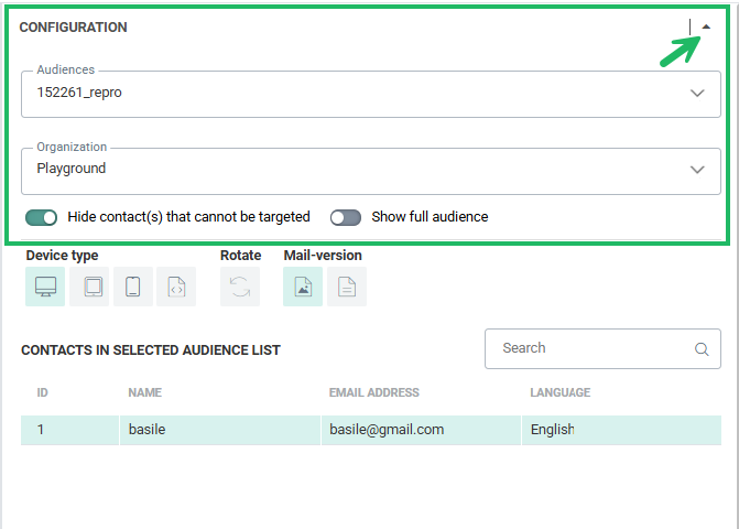 The Audience List and Organization selection, as well as the toggles is now available under the configuration section at the top. This section can be expanded/collapsed to gain usable space.
