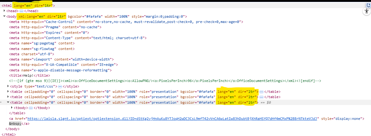 Based on the language of the message, upon Publish, a lang and dir attribute is automatically added to the HTML tag in your messages as well as to the body. The dir attribute indicates the direction in which the text needs to be read, ltr or rtl. This is important because these tags are used by browser AI translations.