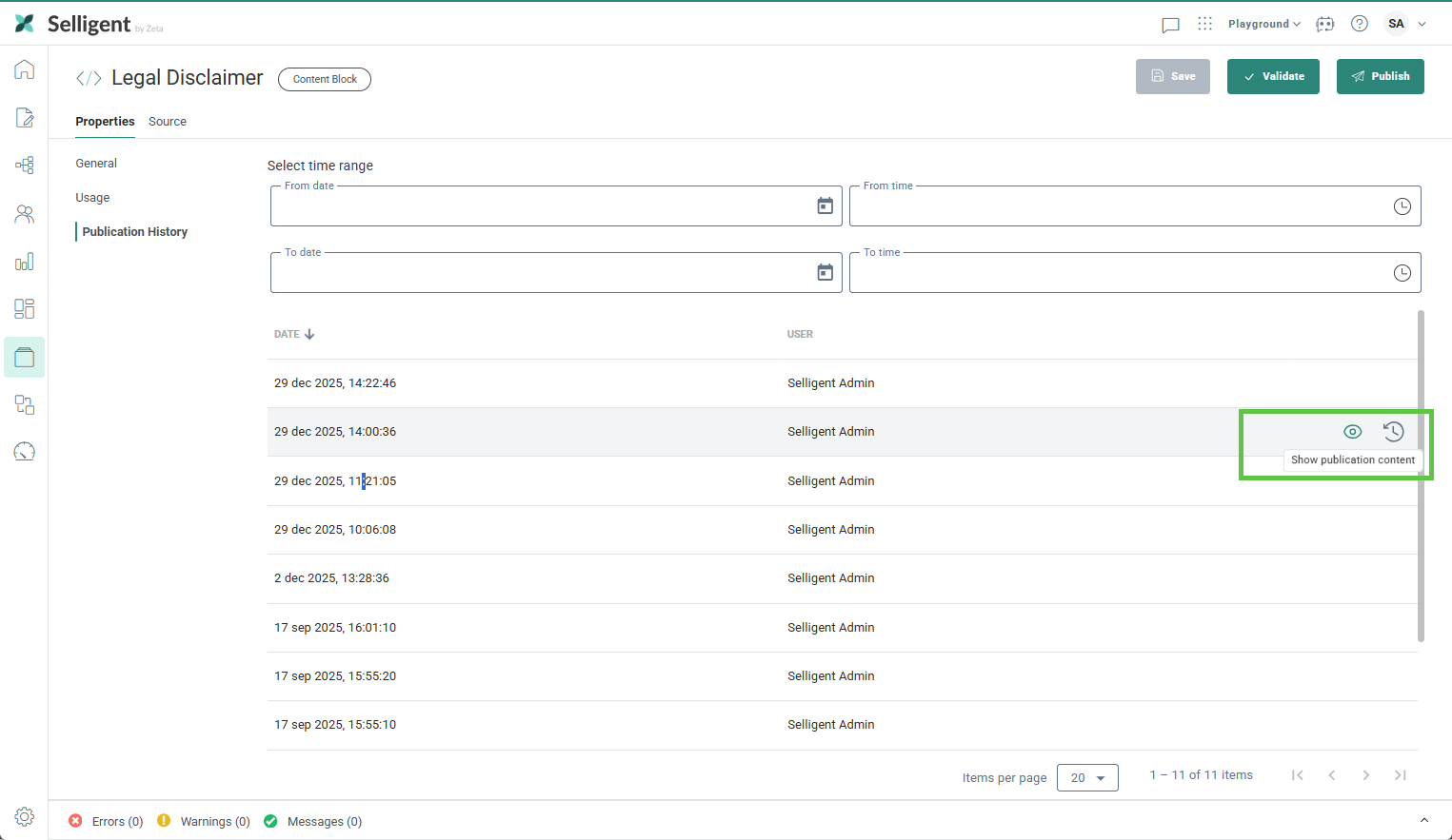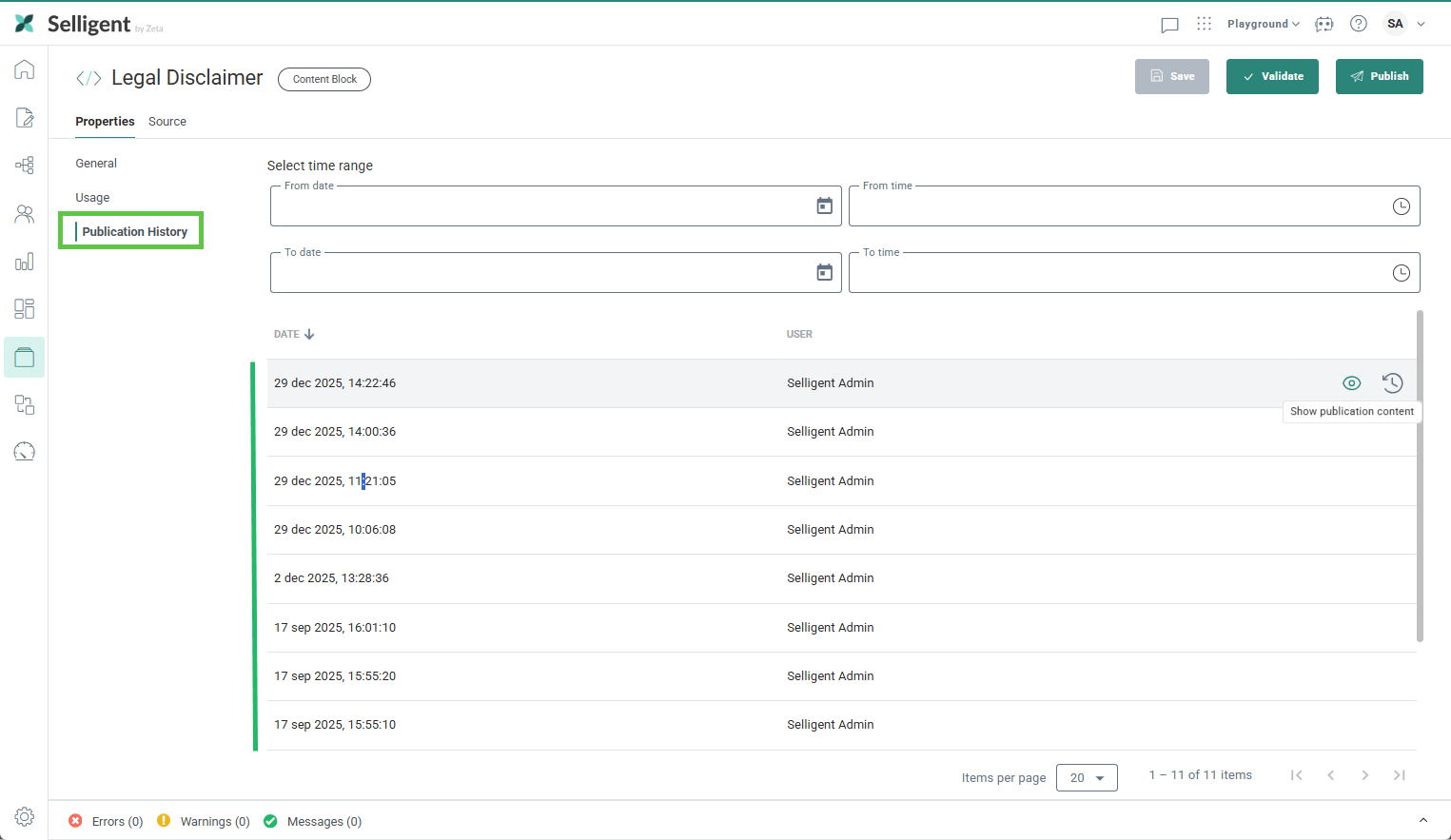 Whenever a Content Block is updated, you can make the applied changes available for use in messages, by publishing the Content Block. With each publication, a new version of the Content Block is created. These are all accessible from the Publication History overview: