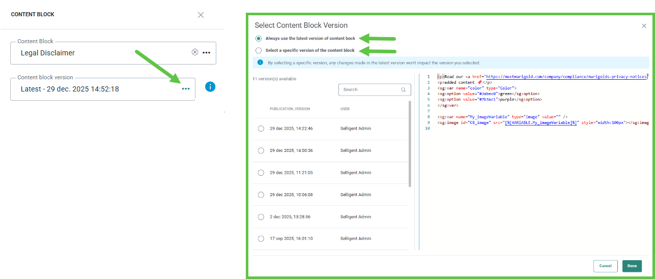 If you do not want the content to change over time, you can select a specific version of the Content Block.