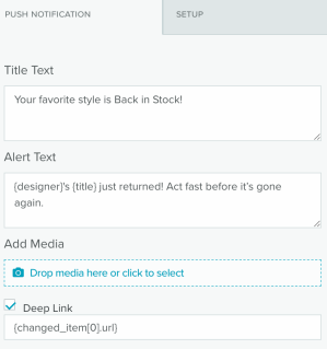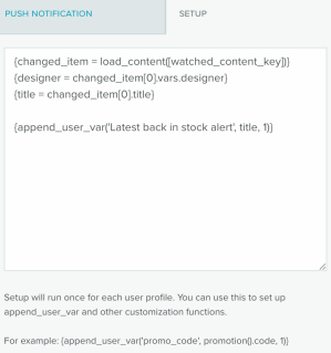 You now have increased flexibility and power to tailor messages to each subscriber at scale. A new Setup tab has been added to the Push / In-App template editor. This is where Zephyr code can be included to prepare data for your template, such as assigning vars, setting up append user var, loading content for back-in-stock notifications, and running the personalize() function to obtain user-specific content recommendations (where a data feed is not required).