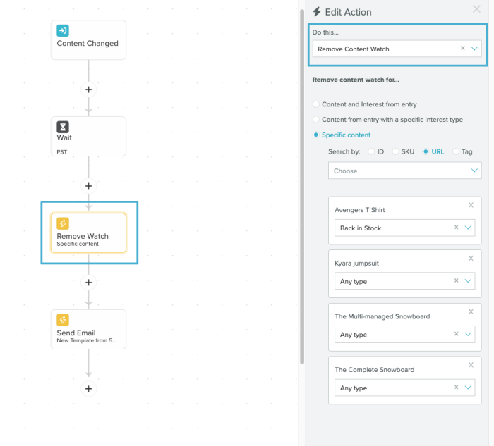 A new action step allowing easy removal of content watch items using content identifiers and specific interest types directly in Lifecycle Optimizer. This gives more autonomy and efficiency for marketers, reducing dependency on engineering, and simplifying profile management.