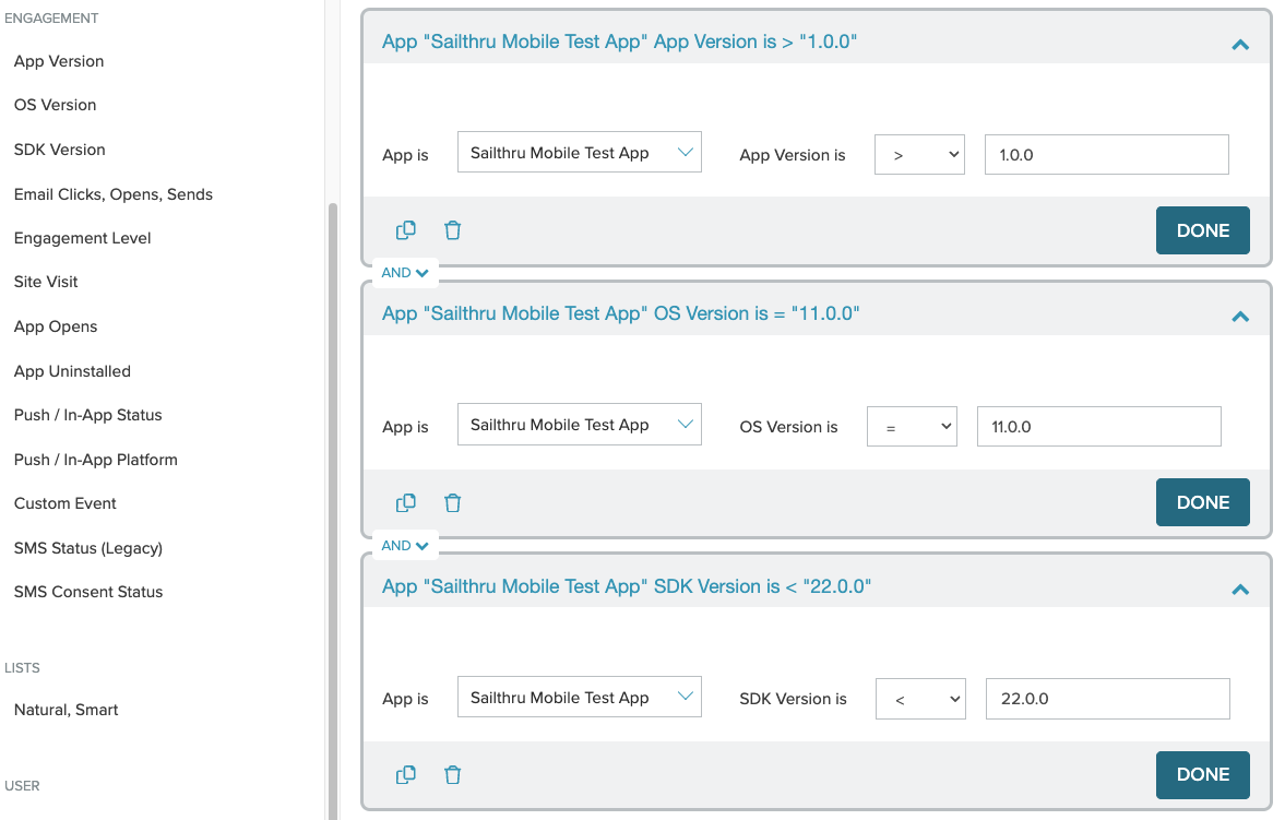 You can now segment and target your mobile audiences without ever having to leave the core Sailthru platform. Audience Builder now includes filters for App Version, SDK Version, and OS Version, giving you more precise ways to connect with customers based on their mobile experience and technology.