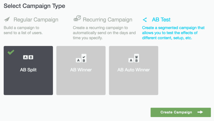 For AB Test campaigns, you'll have the option to select the type of test for your campaign.