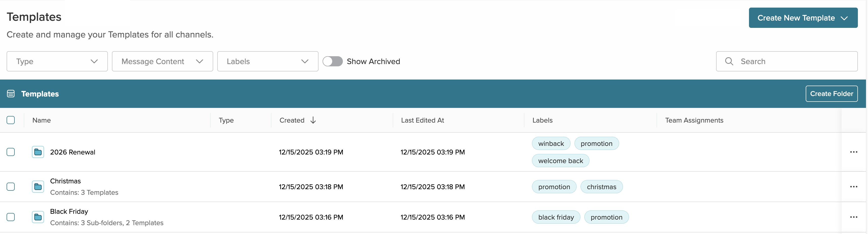 Manage your templates and reduce complexity with folders. Go beyond labels to segment your templates by marketing or strategic initiatives or organize your assets by team.