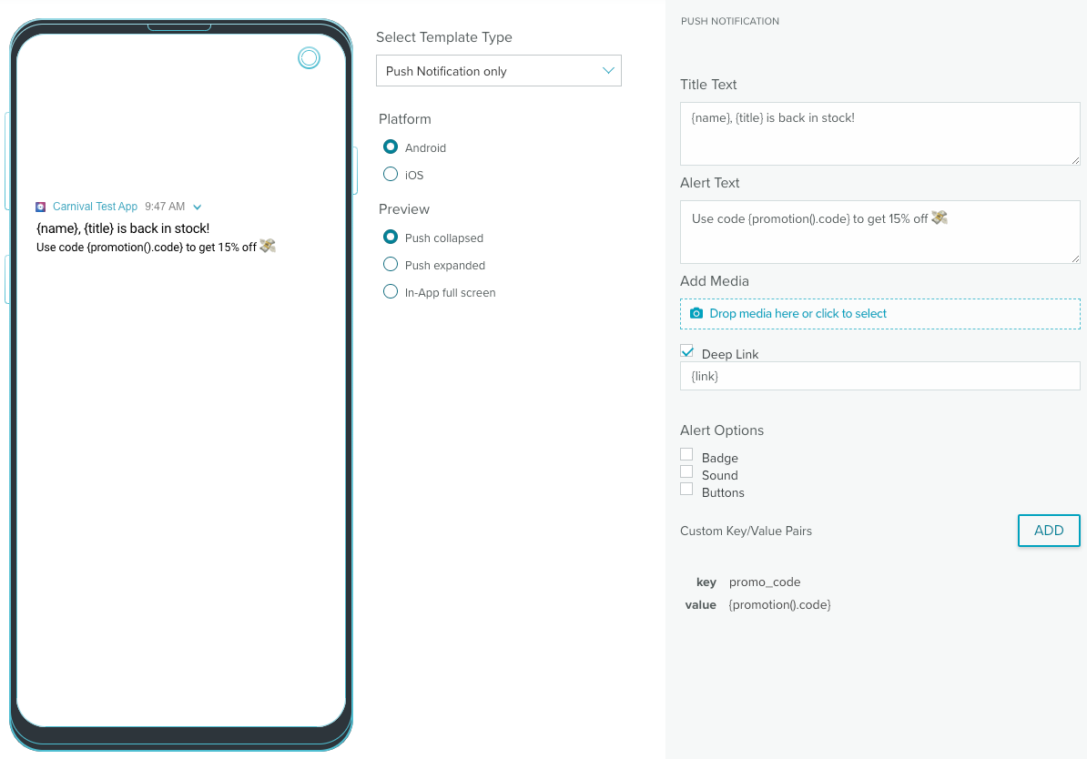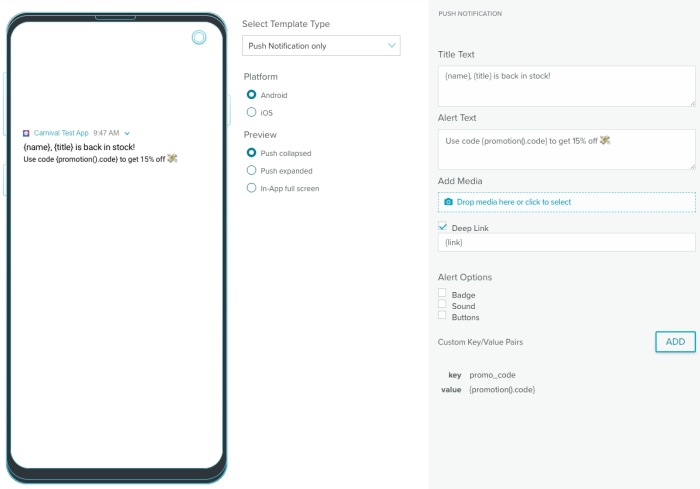The Push Notification template editor includes two text boxes, one for the Title Text and one for the Alert Text, an Add Media option, Deep Linking, custom Alert Options, and Custom Key/Value pairs.