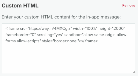 While you can enter any custom HTML into the text box, there are best practices and limitations to keep in mind for creating In-App messaging. See the Best Practices for HTML in Mobile Messaging documentation for more information.