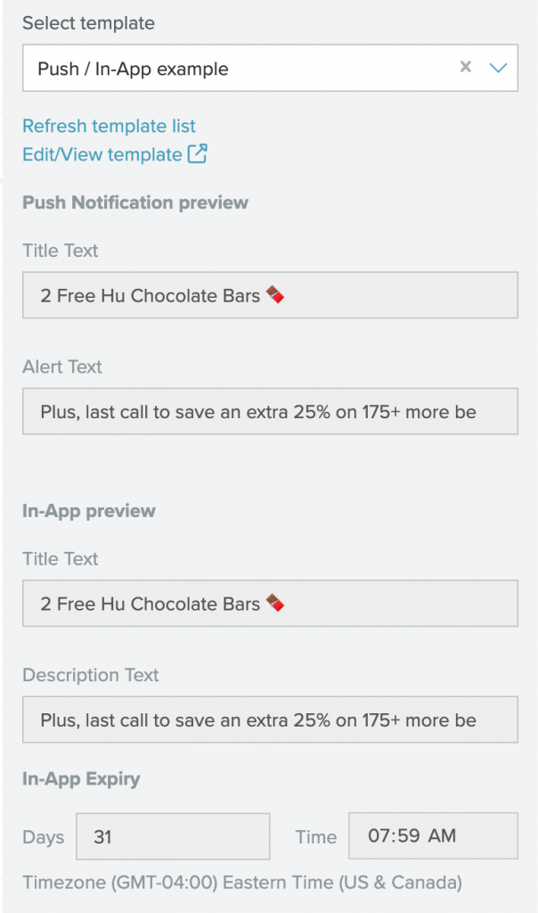 - The selected template's Title and Alert/Description text displays, in addition to the Expiry time frame if the template contains an In-App message.