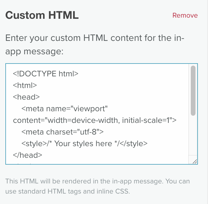 While you can enter any custom HTML into the text box, there are best practices and limitations to keep in mind for creating In-App messaging. See the Best Practices for HTML in Mobile Messaging documentation for more information.