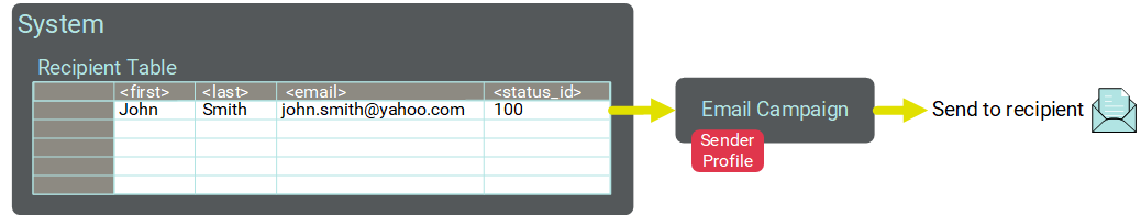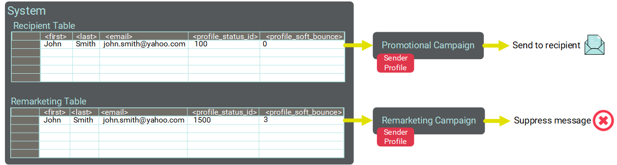 In the example depicted below, the same handle (john.smith@yahoo.com) is present in both sending tables. The same Sender Profile has been assigned to both tables. Each table maintains its own corresponding Status ID field for that Sender Profile. The Client deploys two Campaigns -- one each from the Recipient table and the Remarketing table. In the Recipient table, this handle has an eligible Status ID of 100, and the message is successfully deployed. However, this same handle on the Remarketing table has an ineligible Status ID of 1500, so this consumer is automatically suppressed from the remarketing Campaign.
