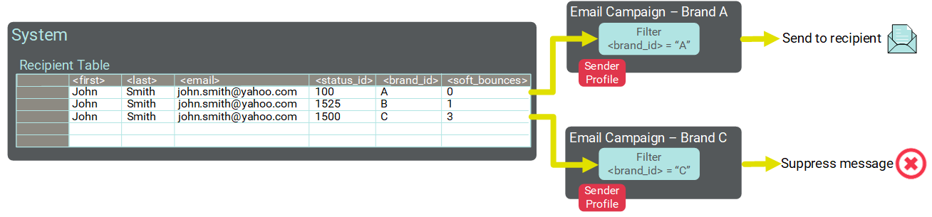 In the example depicted below, the same handle (john.smith@yahoo.com) is a customer of three different brands. Therefore, the same handle appears in three different physical records. The Client deploys Campaigns for Brands A and C, using a Filter to identify the correct target audiences. For Brand A, this handle has an eligible Status ID of 100, and the message is successfully deployed. However, this same handle for Brand C has an ineligible Status ID of 1500, so this consumer is automatically suppressed from the Brand C Campaign.