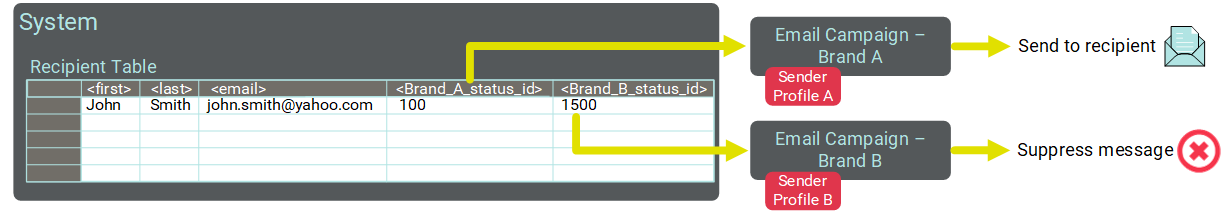 In the example depicted below, the same handle (john.smith@yahoo.com) is a customer of two different brands. Therefore, the same handle appears once in the sending table, but with two different corresponding Status ID fields -- one for each Sender Profile. The Client deploys two Campaigns, using the two different brand-specific Sender Profiles. For Sender Profile A, this handle has an eligible Status ID, and the message is successfully deployed. However, this same handle for Sender Profile B has an ineligible Status ID of 1500, so this consumer is automatically suppressed from the Brand B Campaign.