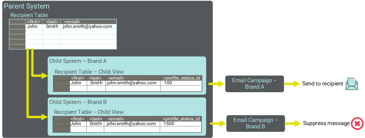 In the example depicted below, the same handle (john.smith@yahoo.com) is a customer of both brands, and therefore is accessible to both Child systems. Each table maintains its own corresponding Status ID value for the Sender Profile. The Client deploys two Campaigns -- one each from the Brand A Child System and the Brand B Child System. In the Brand A Child System, this handle has an eligible Status ID of 100, and the message is successfully deployed. However, this same handle in the Brand B Child System has an ineligible Status ID of 1500, so this consumer is automatically suppressed from this brand's Campaign.