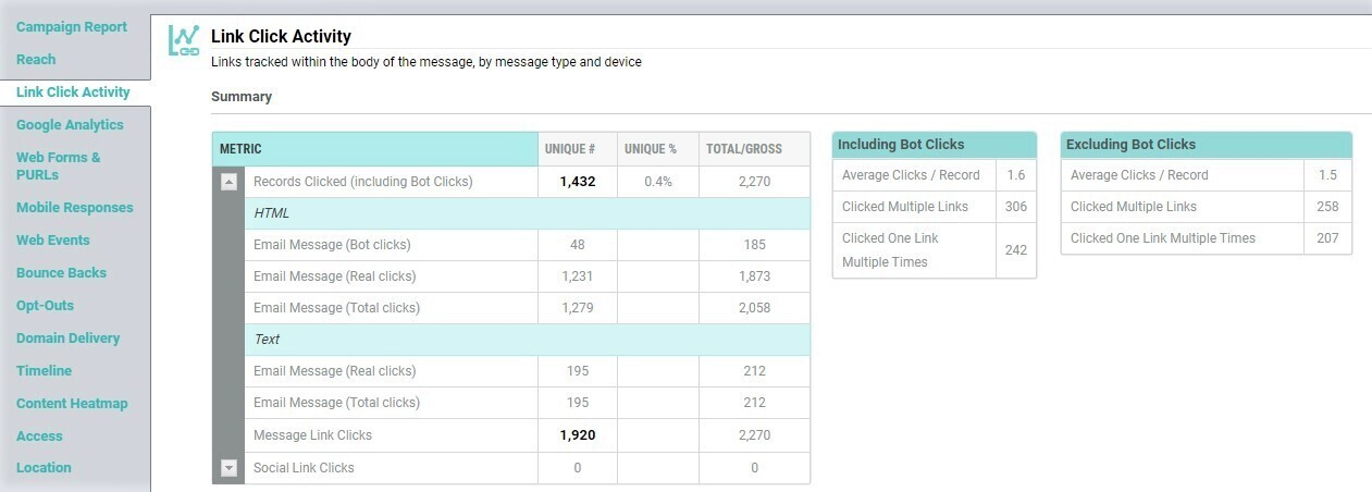 As described above, each time a recipient clicks on a tracked link within an email message, the system captures that action as an Click. For example, if the same recipient clicks the same link three times, the platform captures three distinct Click actions.
