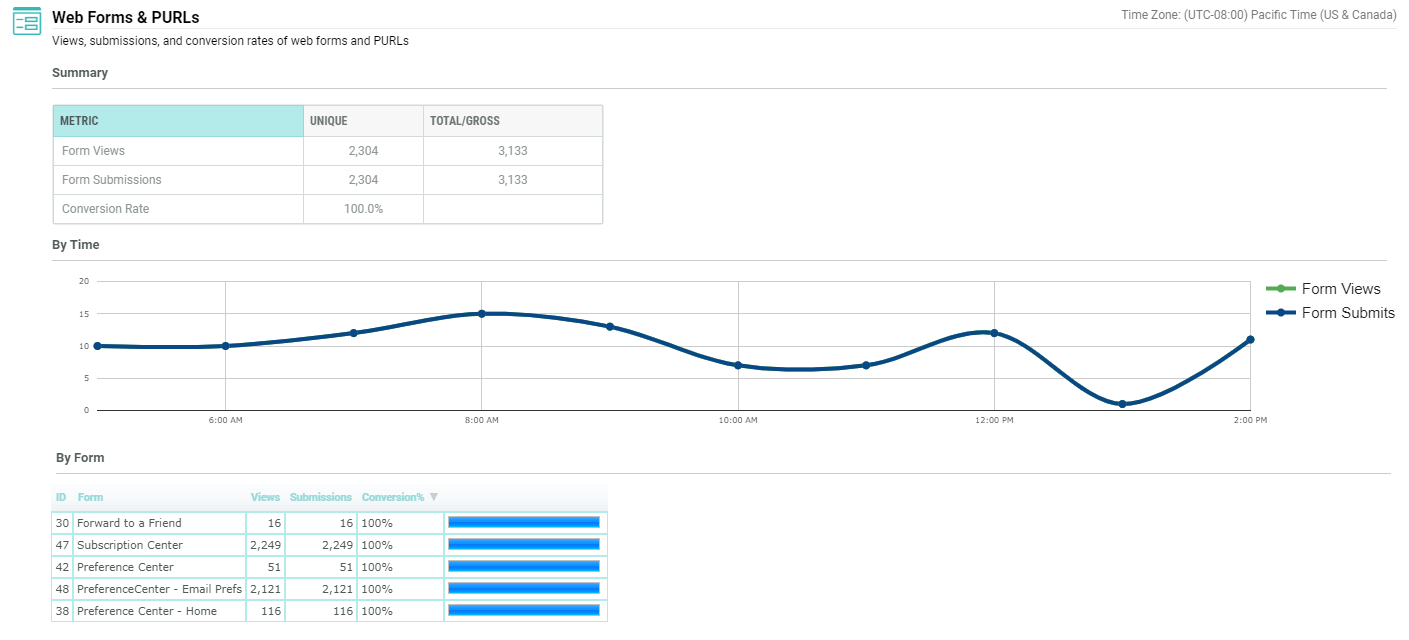As part of Cheetah Digital by Zeta's standard Campaign Reports, the Web Forms & PURLs sub-report and the Timeline sub-report provide details on the quantity and timing of Form Submissions that occurred as a result of a Campaign.
