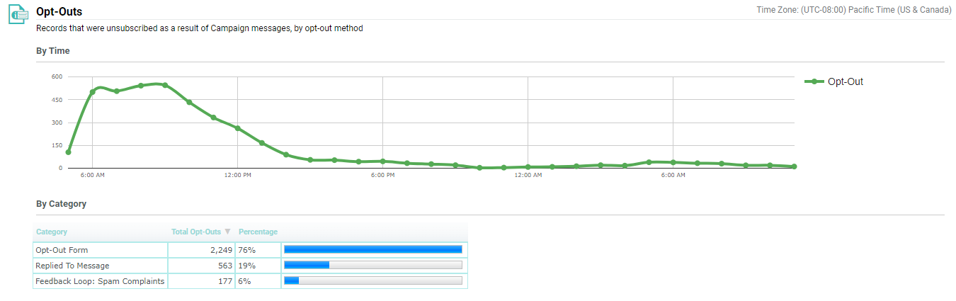 As part of Cheetah Digital's standard Campaign Reports, the Opt-Outs sub-report and the Timeline sub-report provide details on the quantity, timing, and type of unsubscribe requests that occurred as a result of a Campaign.