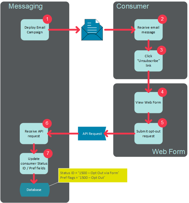When the consumer submits the web form, the contents of the web form are transmitted to Cheetah Digital by Zeta by means of an API request message (for more details on this API request, please see HTTP POST Data Load API). The platform receives and processes this request message, and updates the consumer's Status ID (and optionally also the relevant Preference flags). The Status ID for consumers who unsubscribe in this method is '1500 - Opt-Out Via Form.'