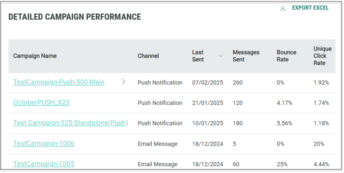 Detailed Campaign Performance: This report presents a summary of all the campaigns with quick links to deeper reporting details. The list can also be exported as an Excel file.