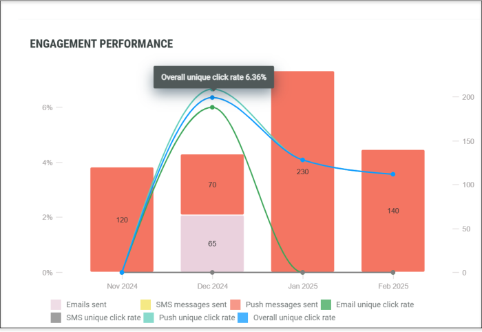 Engagement Performance: This report presents real-time campaign performance metrics across Email, Push, and SMS channels. It includes a bar chart displaying the number of messages sent and a graphical representation of unique click rates. Hover over the graph to view specific percentage details.