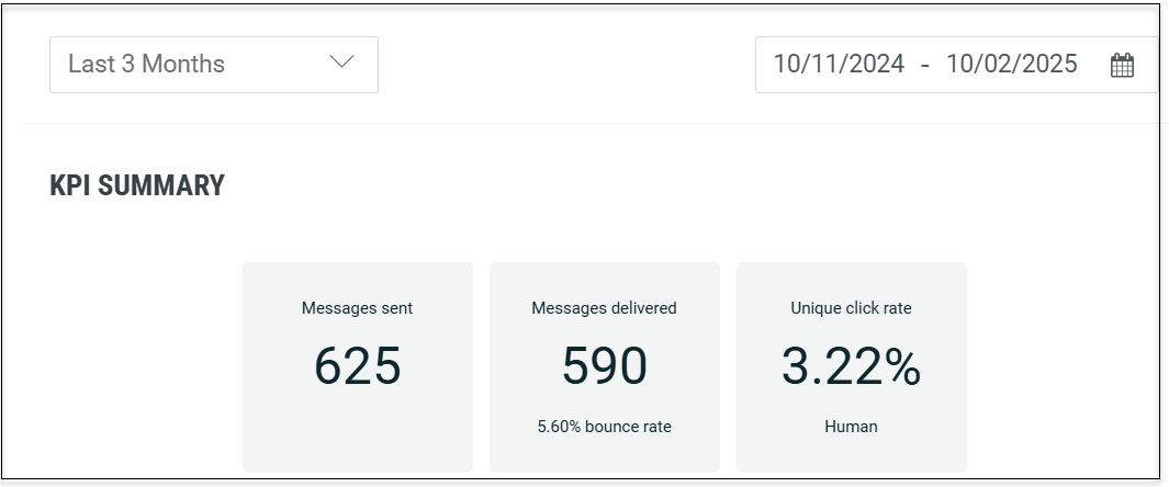 KPI Summary: This report provides summary of key performance indicators across multiple channels, including the number of messages sent, messages delivered, and unique click rates.