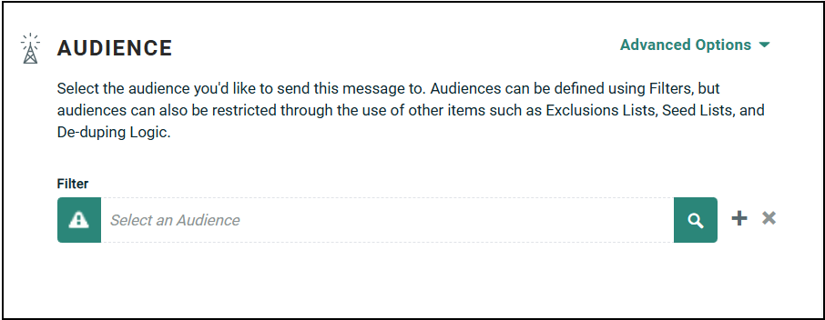 The Audience sub-section is used to identify to whom you're sending your Campaign message. The platform offers several different options to both select and restrict your Campaign Audience.