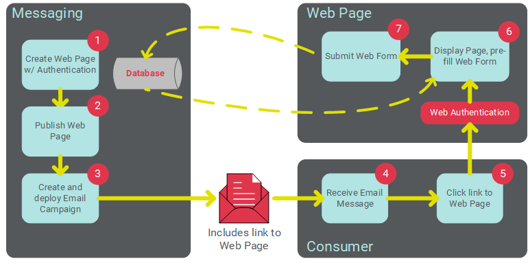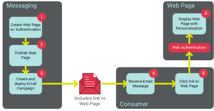The following diagram depicts this process of using a Web Page in conjunction with an Email Campaign. The email message contains a link to the Web Page. When the customer clicks this link, the URL passes the necessary identifying information (via a Web Authentication) to the Web Page to validate the customer's identity, in order to display the correct personalization values.