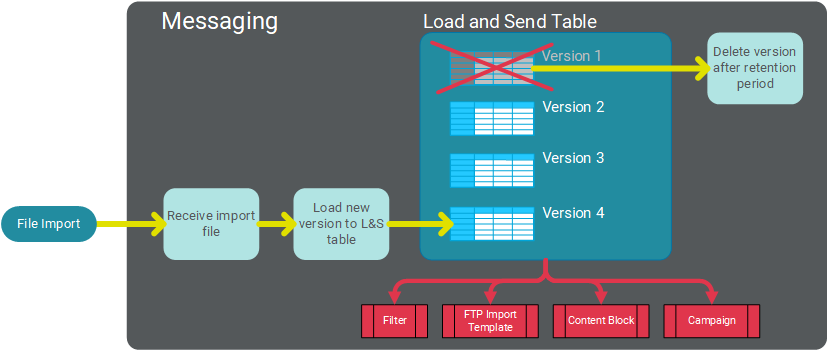 Also, any assets that the client defines (such as Content Blocks and Filters) are assigned to the Load and Send table, and not to a specific version of that table. Therefore, these assets can be reused since they're not assigned to the temporary versions.