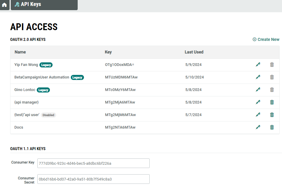 The primary purpose of the API Keys screen is informational -- you can view your Consumer Key and Consumer Secret so that you can integrate these values into your API token request message. To create, view, edit or delete the API Keys you must have administrator access or belong to the Access Group with relevant permissions to perform these management actions. For more details on Access Group, see Security Settings