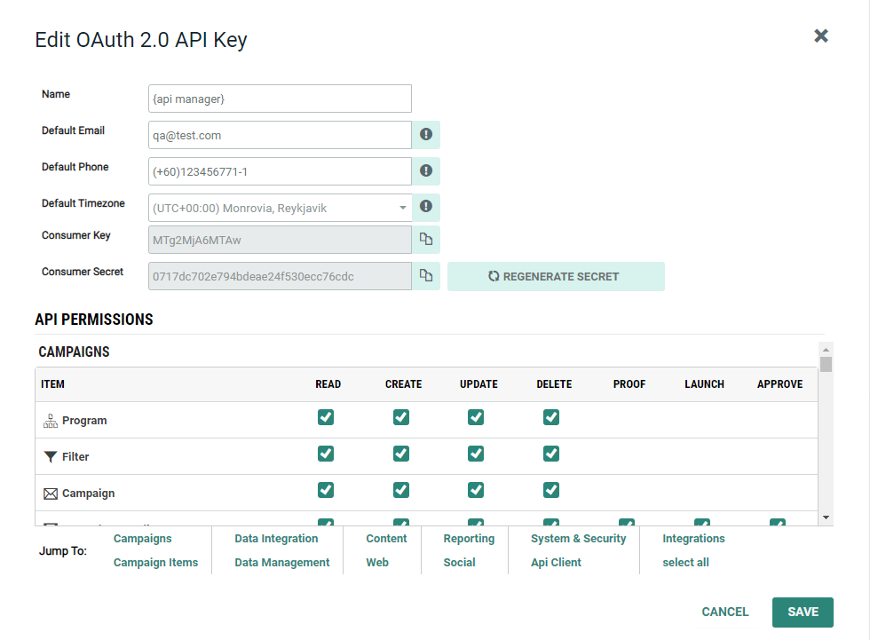 Authentication with OAuth 2.0 requires you to obtain a "Consumer Key" and a "Consumer Secret." The Consumer Key is analogous to a username, and is considered public information; the Consumer Secret is analogous to a password, and is kept confidential. These API keys are purpose specific keys for each business unit, assigned to interact with specific section of Engage+ platform.