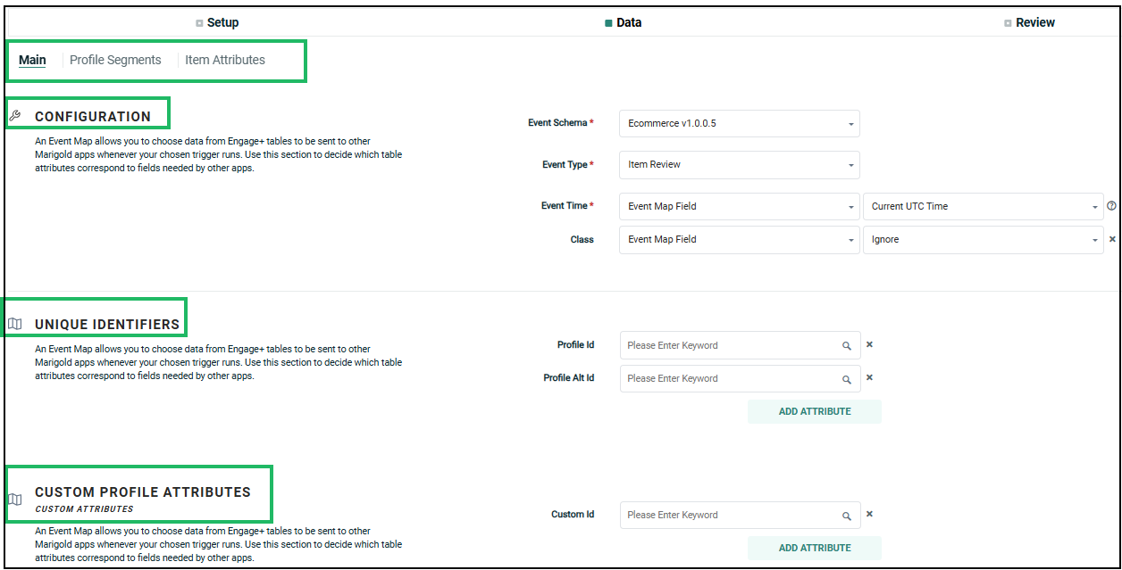 The data available for mapping in the Data tab is grouped into various sections. These sections are added to the Data tab based on the category of the schema attributes added. The available attributes for the event map are determined by the schema and event type selected in the Configuration section.