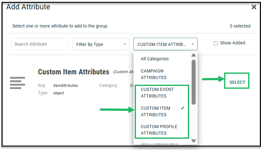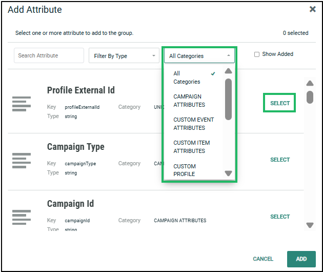 Locate the required attribute to add and click the corresponding Select button.