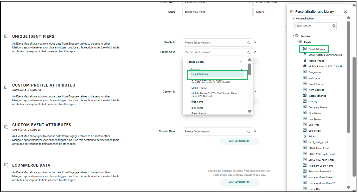 All fields from the data source table chosen during event map creation are available for mapping to schema attributes. You can either select them from the list or drag and drop fields from the Personalization and Library pane on the right side of the screen.