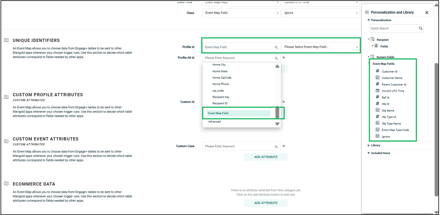 The basic schema attributes for the event map are available in the Configuration, Unique Identifiers, and Ecommerce or Lifecycle Data sections. Additional schema attributes can be added as needed, which will generate new sections based on the attribute category.