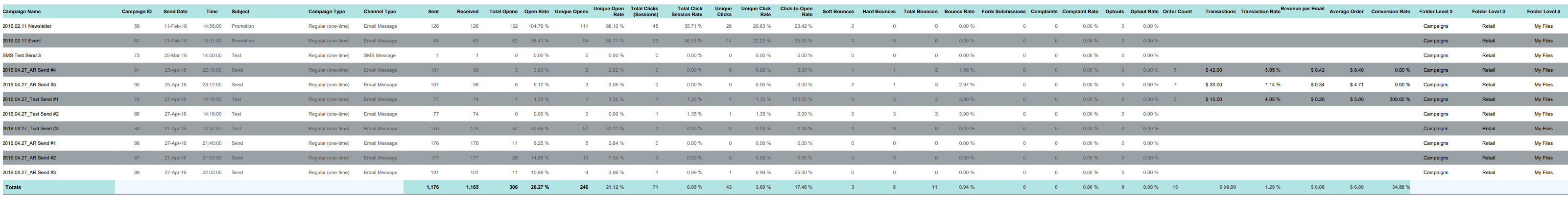 The Campaign Aggregate Report provides all Key Performance Indicators (listed below) at a daily Campaign level. The metrics for Date- and Event-triggered Campaigns (which typically deploy more than once) are grouped together daily.