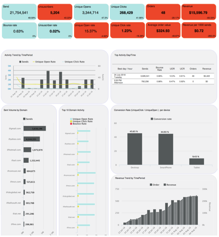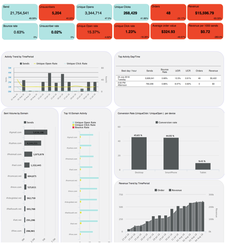 The Campaign Summary Dashboard provides a holistic summary of all Campaign metrics sent within the selected date range, and also allows you to compare performance with any previous date range. The metrics along the top of the report are color-coded to indicate whether a particular metric increased (blue) or decreased (red) between the two date ranges being compared. Each metric also indicates the percentage of change between the two date ranges being compared.