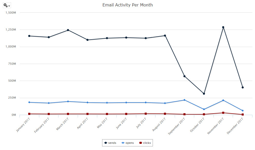 Charts, such as bar graphs, line graphs, and pie graphs, are used to summarize and present data graphically. Within the Marketing Intelligence Report Manager, you can choose from a wide range of chart types, define different levels of aggregation for rows and columns, and zoom in to see chart details. For example, the following line graph plots the quantity of email sends, opens, and clicks over time: