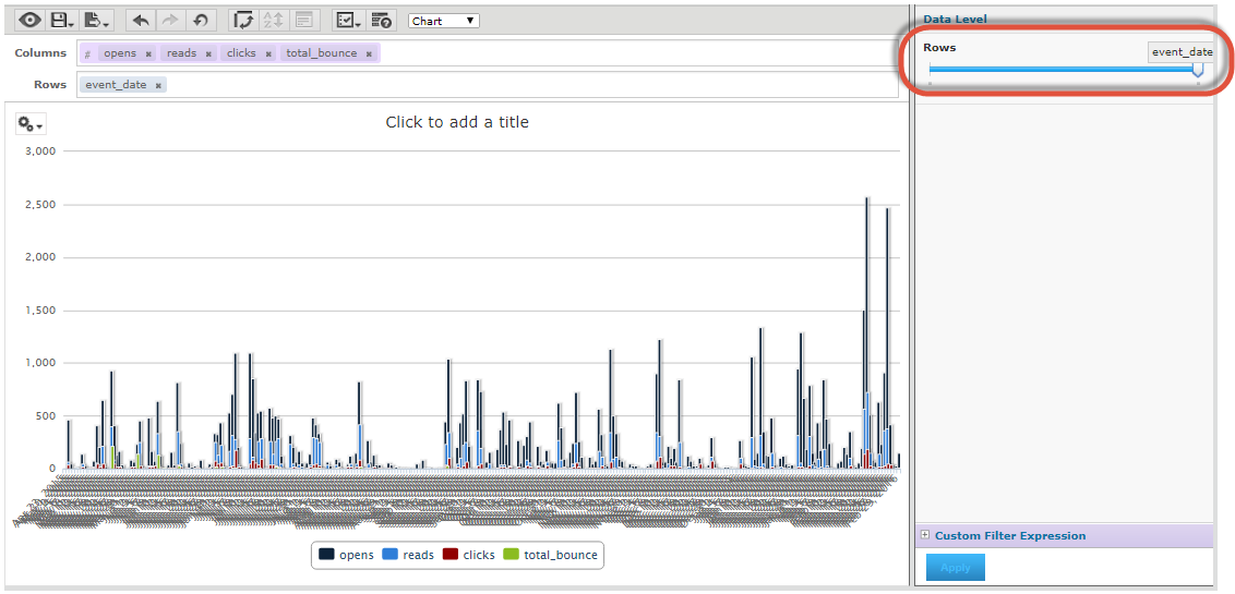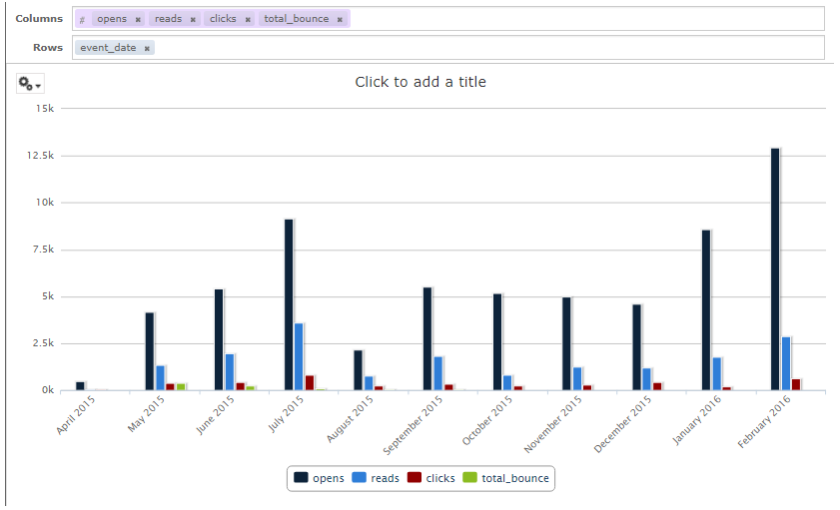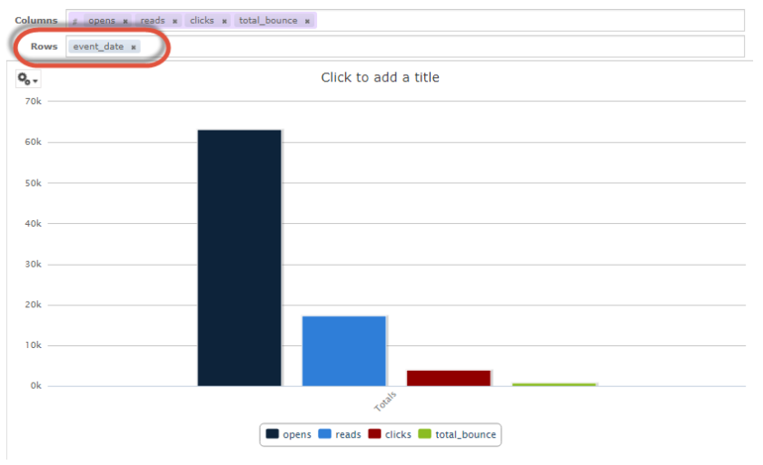 For example, let's say you want to create a column chart that shows the number of email opens, reads, clicks, and bounces, per month. You would add those four measures as Columns in the chart. Then you would add the date field as a Row, as this date represents how you want to group the four measures.