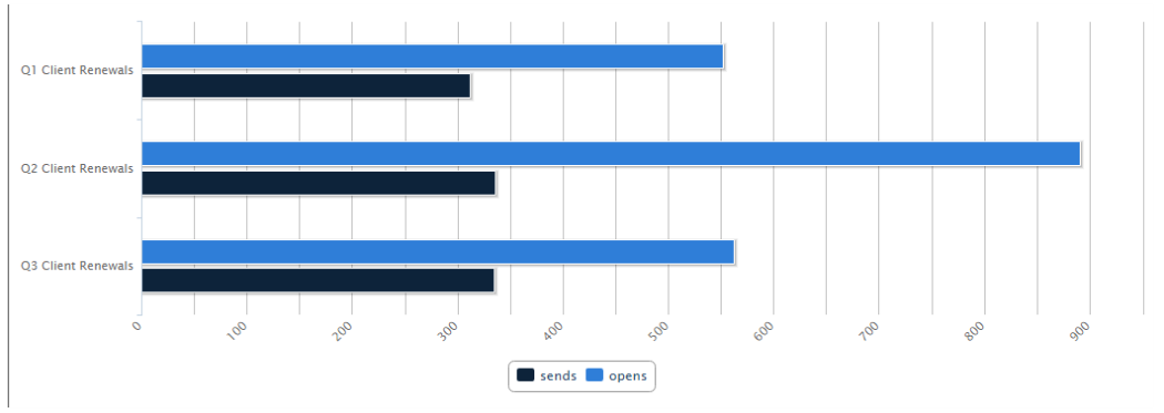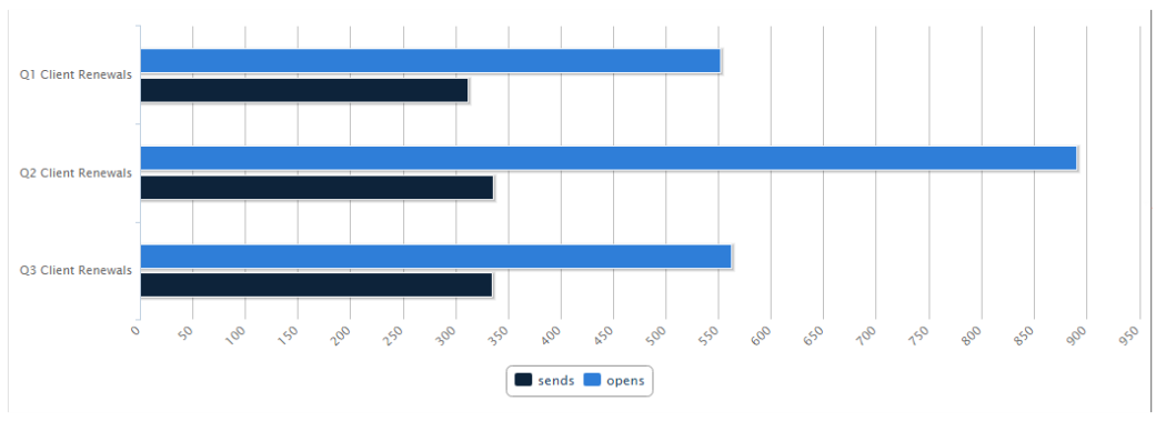 You've created a bar chart showing the number of emails sent and opened for three different Campaigns. The system has selected a scale of 50 (50, 200, 150, 200, etc.), and displays the number next to each step.