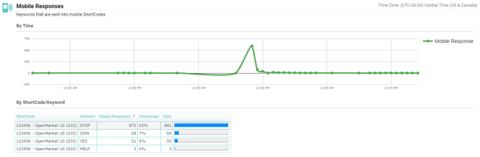 The Mobile Responses Report provides additional detail on the quantity and timing of Keyword responses that occurred as a result of the Campaign. Keywords are organized into SMS Keyword Groups, which are then assigned to Campaigns. When a recipient texts one of these keywords to your Short Code, the system tracks that response, and attributes it to the Campaign.
