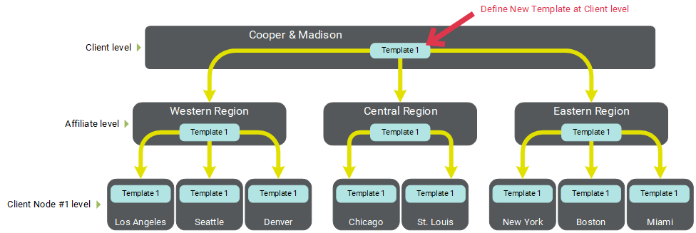 Example #1: In this example, Cooper & Madison has an email Template that needs to be available to everyone in the entire organization, so the Template is defined at the Client level. By default, access to this Asset cascades downward, meaning this Template will be available to every Affiliate and Client Node with no further configuration needed.