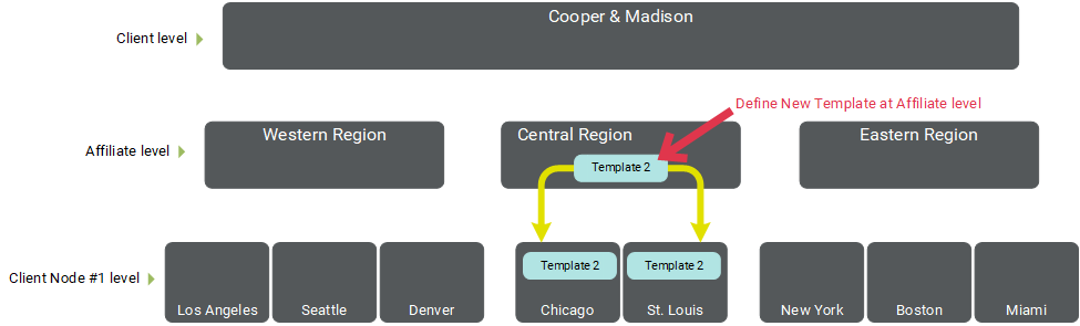 Example #2: Cooper & Madison has a second Template that needs to be available only to Client Nodes within the Central region. Therefore, the new Template is assigned to the "Central Region" Affiliate. By default, access to this Asset cascades downward, meaning this Template will now be available to all the Client Nodes beneath the "Central Region" Entity (that is, "Chicago" and "St. Louis") with no further configuration needed.