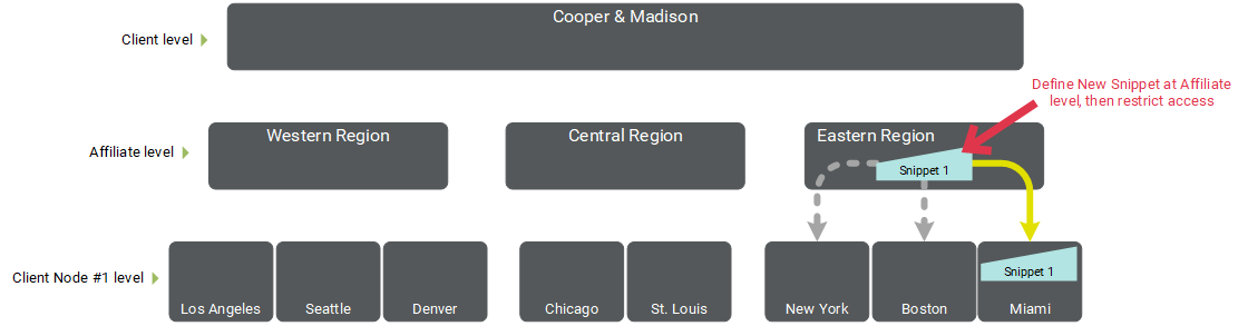 Example #3: Cooper & Madison has a new Snippet that needs to be available to ONLY the "Miami" Client Node. Therefore, this new Snippet is assigned to the "Eastern Region" Affiliate. By default, this Snippet would be accessible to every Client Node beneath this Affiliate. Instead, the Snippet is manually configured to be associated with only the "Miami" Client Node.