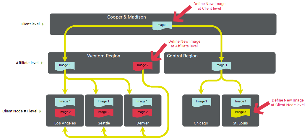 Image 1 needs to be available to everyone, so this Image is assigned at the top-most Client level. Access to this Image cascades down to the entire Hierarchy.