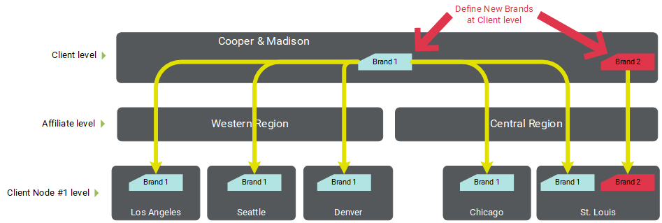 Example: Cooper & Madison has two new Brands that they want to be able to use when building a Mailing. The first Brand needs to be available to every Client Node. The Brand is defined at the Client-level, then manually associated with every Client Node. The second Brand is unique to only the "St. Louis" Client Node. The Brand is defined at the Client-level, then manually associated with just "St. Louis."