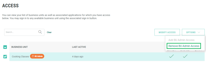 Before you grant Business Unit administration privileges to a user, they must first be assigned to the Business Unit(s) for which they are to serve as administrator. See Modify User Access for more information.
