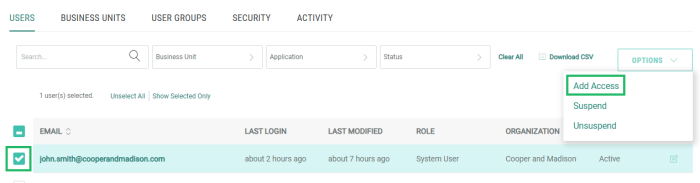 From the Users tab in the Administration environment, add access to one or more users to one or more User Groups, Business Units, and applications (you can’t remove access using this method). This option also allows you to assign a custom Role if the selected application supports the App Attributes feature (see Role Assignment below for details on this feature).