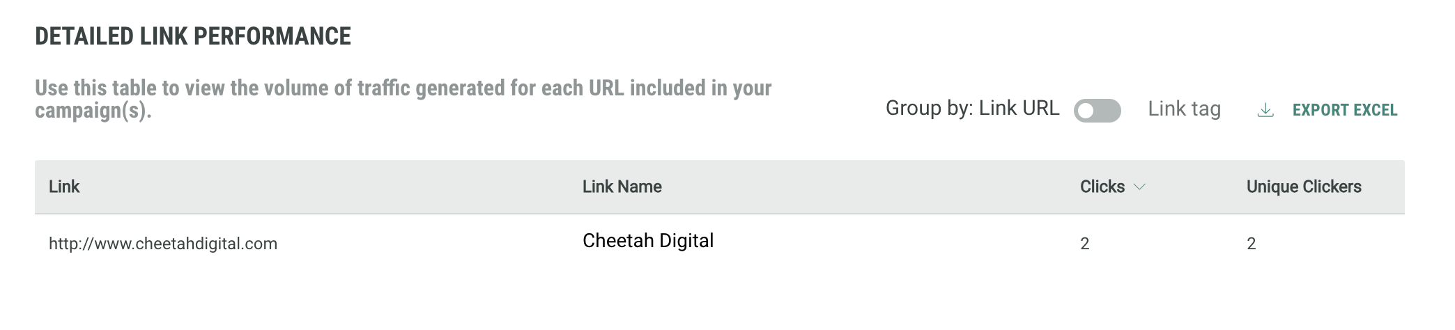 If you are interested in click behavior for individual links, the table view Detailed Link Performance is provided, showing per individual link the number of clicks versus unique clicks.