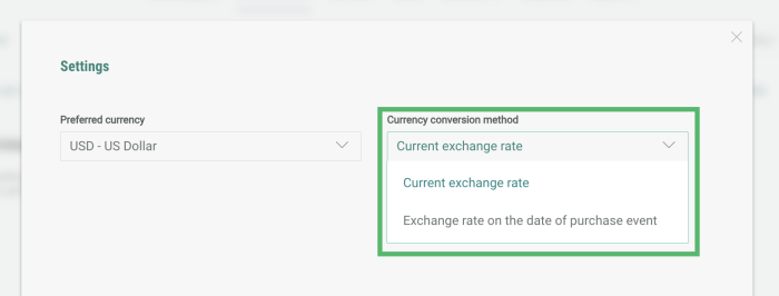 Additionally, if you collect revenue data and you have the Conversions report available, you can choose the exchange rate that is applied to your dashboard.
