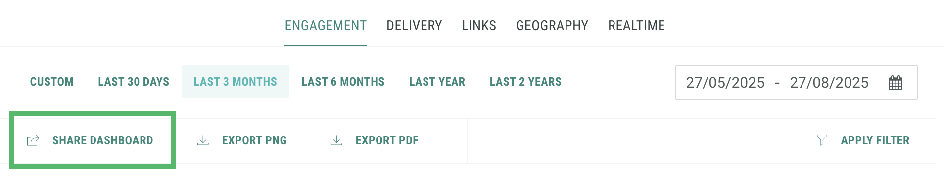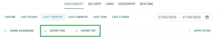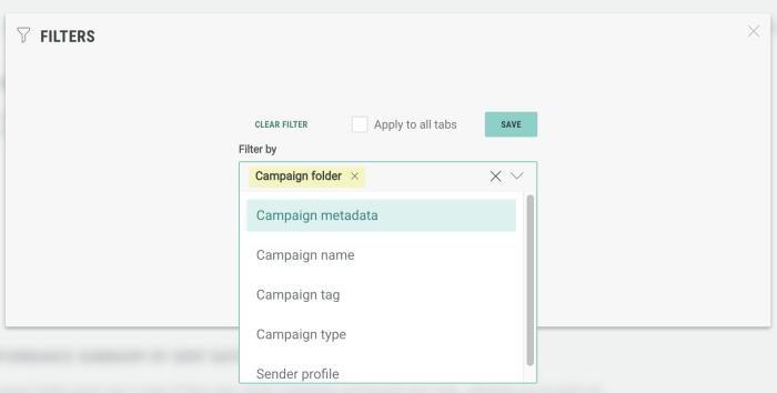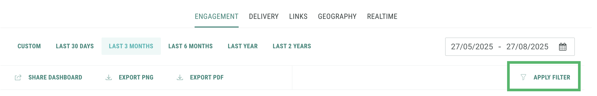 Further filter options are available in multi-campaign Email Dashboard. To use these filters, click Apply Filter.