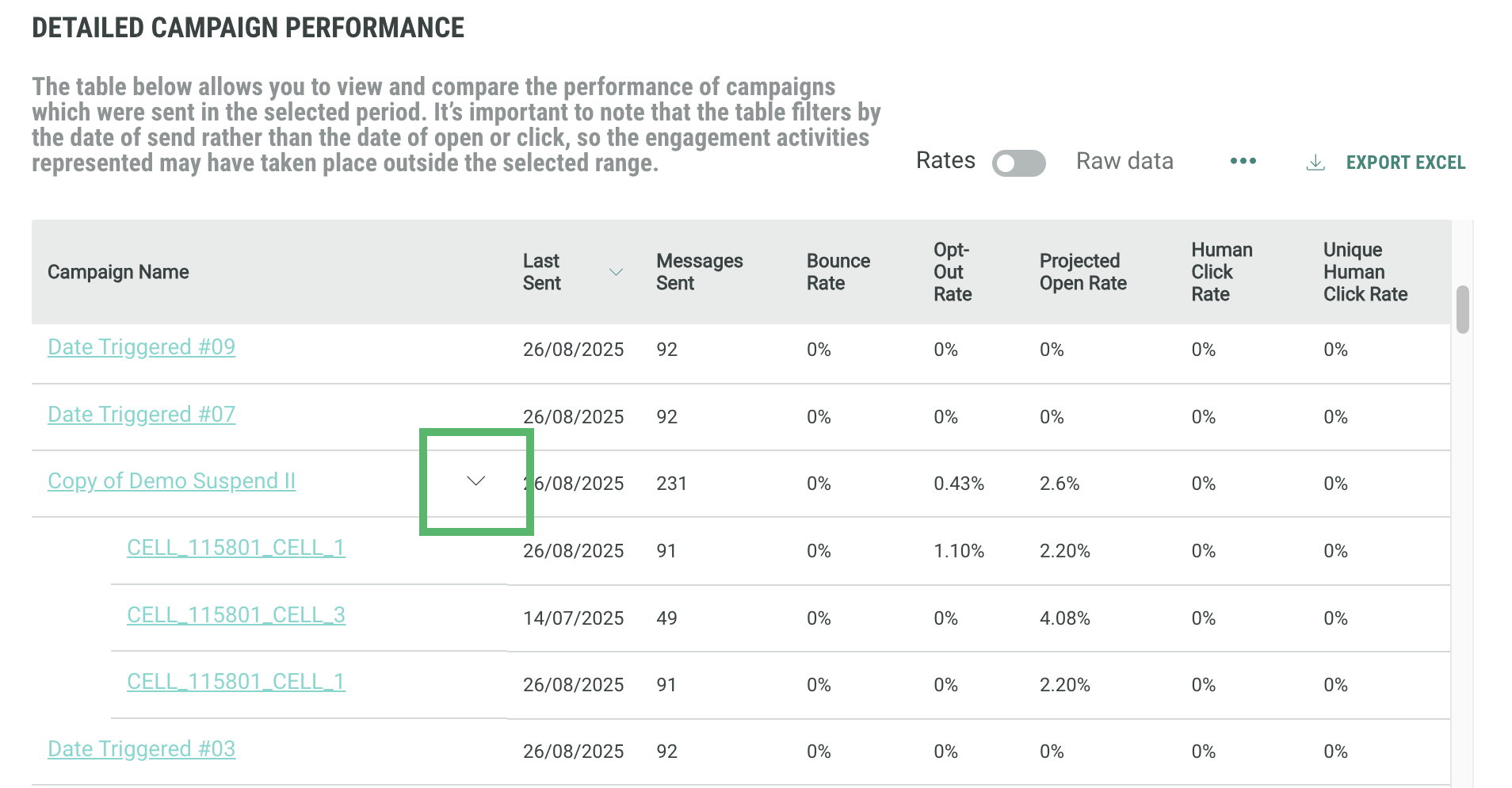 In the Engagement and Delivery Report, when the Detailed Campaign Performance and Detailed Campaign Delivery sections list parent campaigns with child cells, you can click on the arrow next to the campaign to expand the list to show all the child cells.